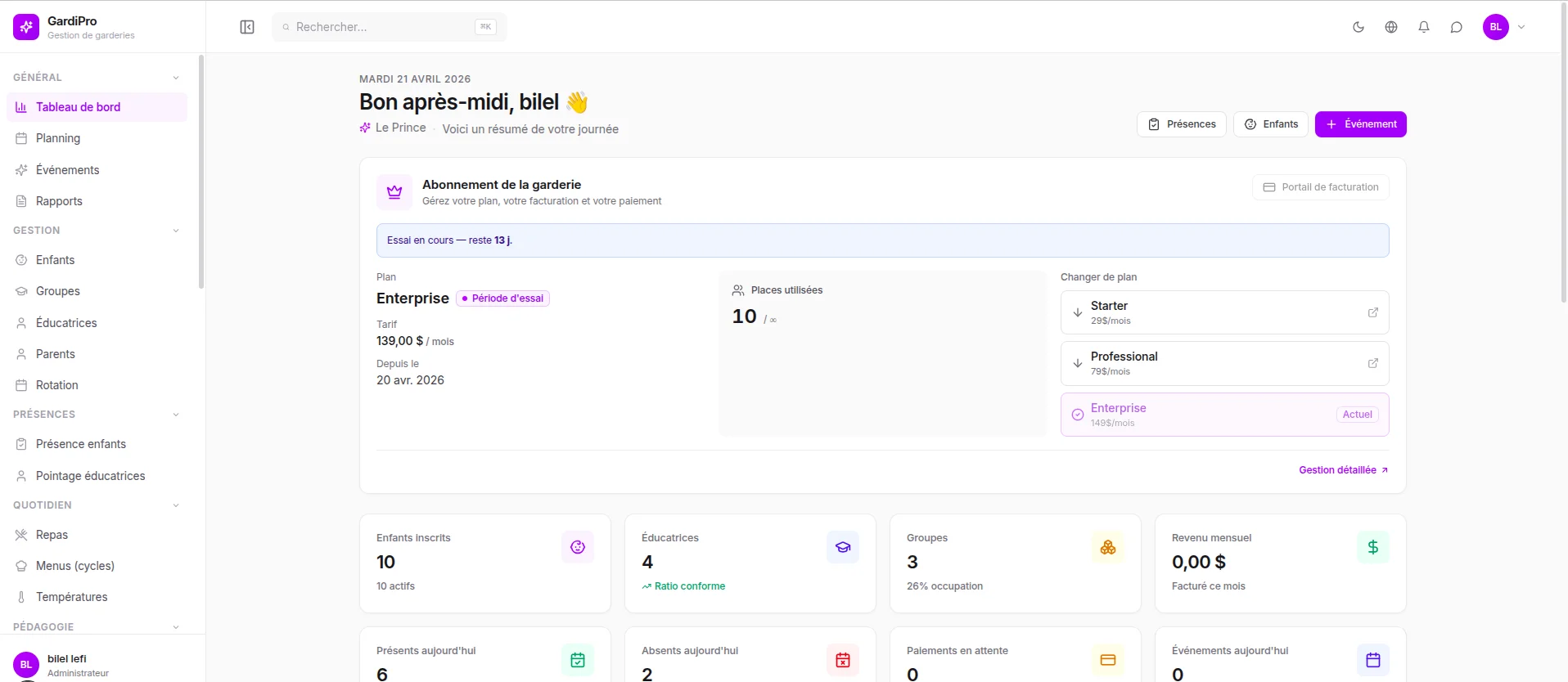 - KPIs temps réel — enfants, présences, revenus, occupation